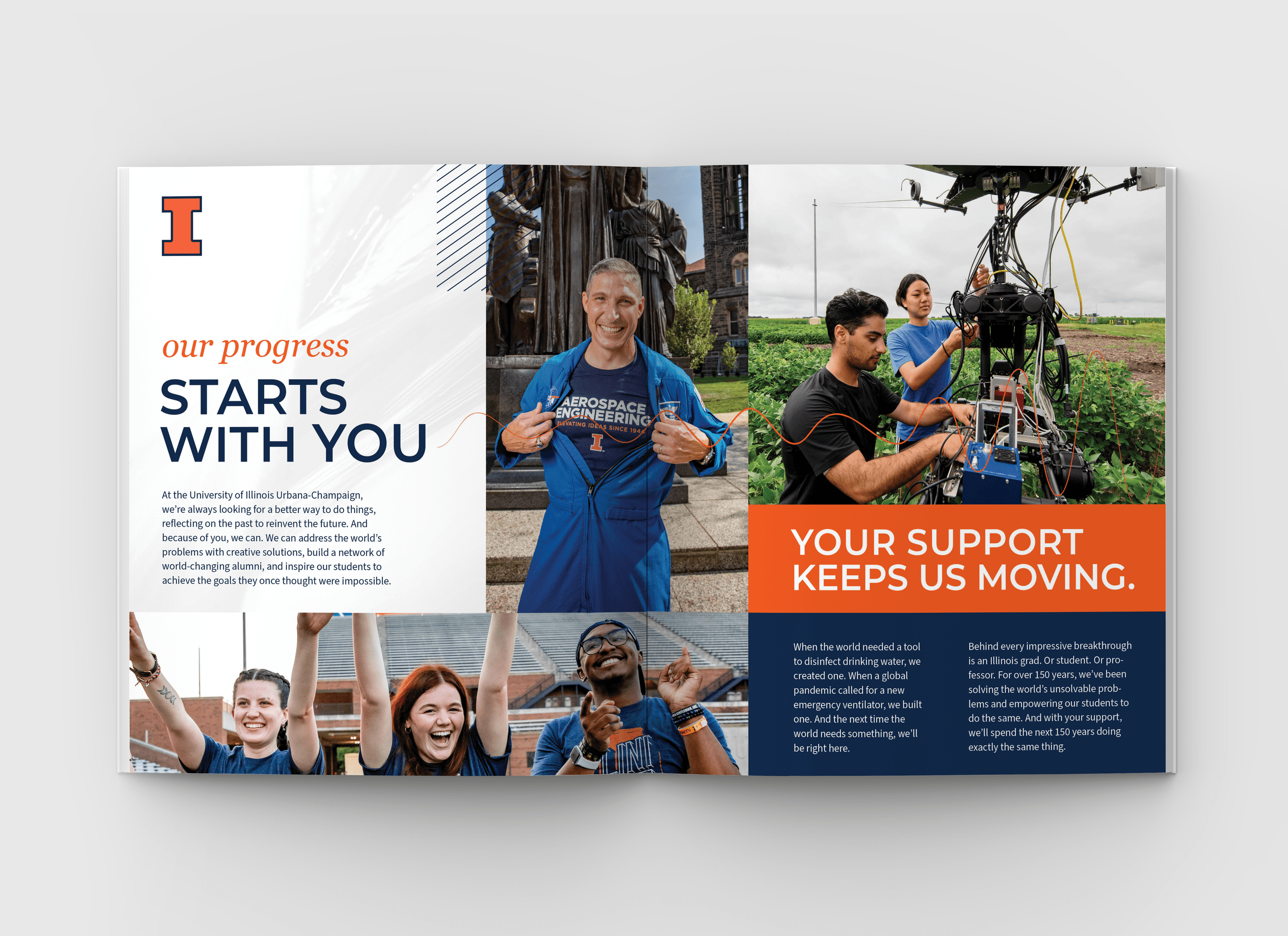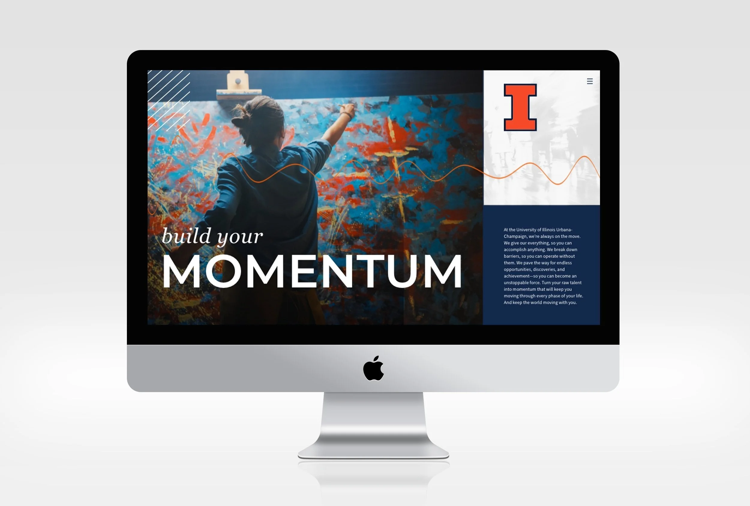 The Momentum campaign brings to life the “Momentum” pillar at the heart of the University of Illinois Urbana-Champaign brand story. This concept demonstrates that the Illinois community pushes for progress in every area—breaking down barriers, building new connections, and making the world a better place for everyone. Momentum is not a demand. It’s a promise: at Illinois, you don’t need to accomplish everything, but you can accomplish anything.